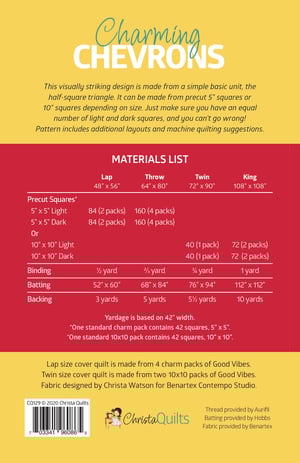 Charming Chevrons is offered in 4 sizes. The smaller sizes (lap/throw) can be made with 5" charm squares. The larger sizes (twin/queen) can be made from 10" squares.